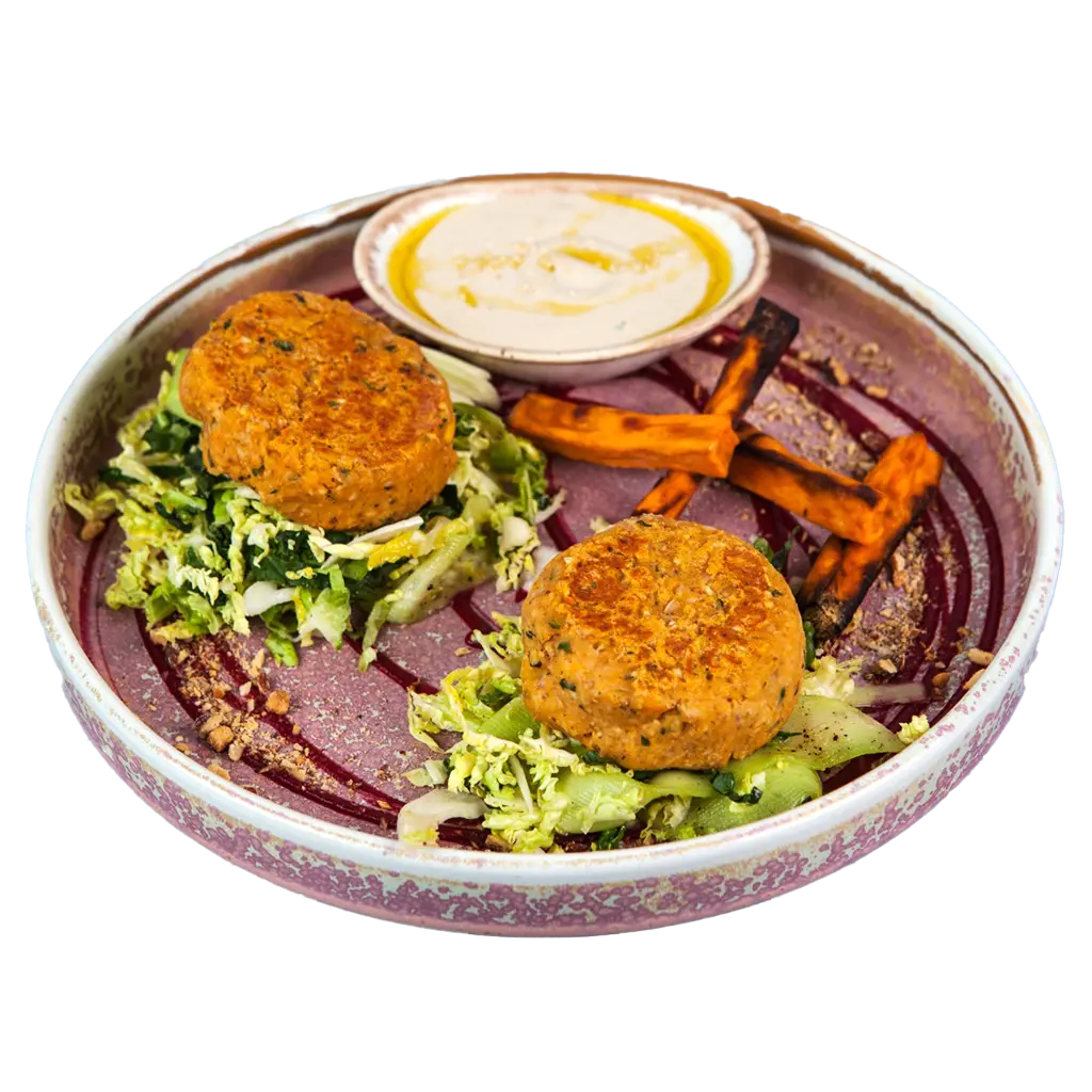 Burger od slatkog krompira i leblebija, sa krastavcem, icebergom i tahini dressingom